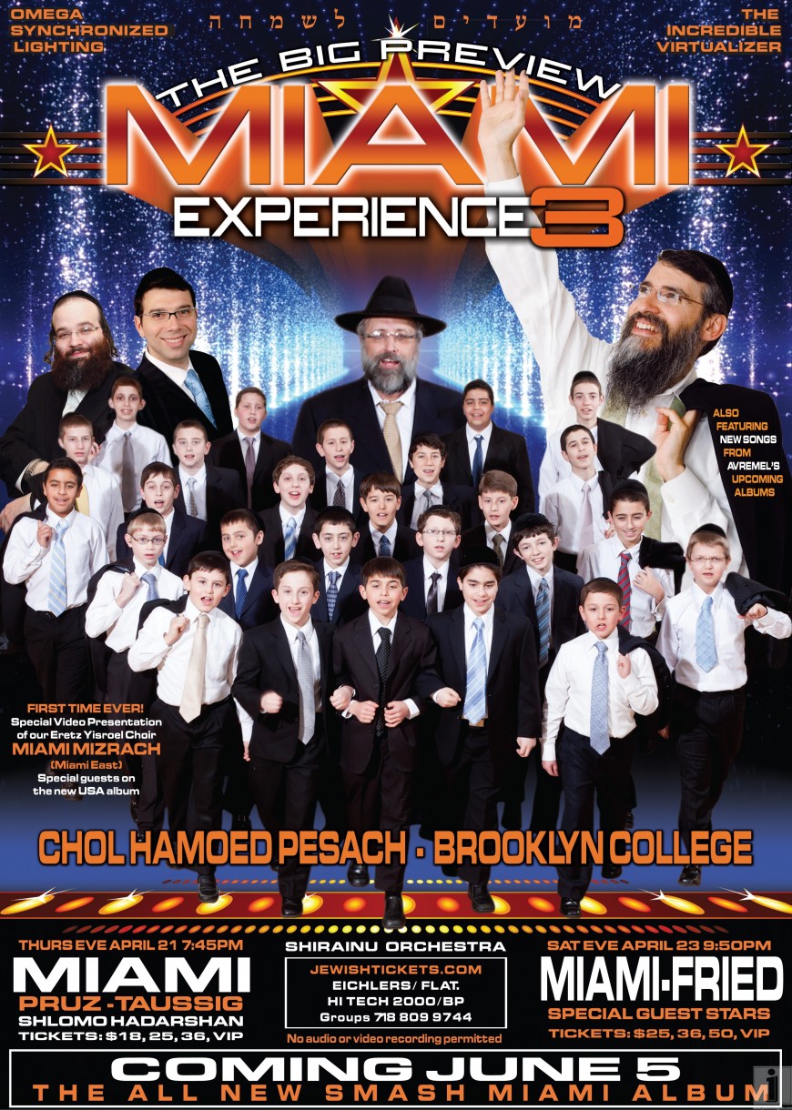 This Chol Hamoed Pesach – 2 blockbusters shows at Brooklyn College. MIAMI EXPERIENCE 3 – THE BIG PREVIEW. Featuring a whole new never before seen stage and lighting extravaganza, built on the successes of the last 2 years, MIAMI EXPERIENCE 1 AND 2. This year will feature OMEGA SYNCHRONIZED LIGHTING – especially designed lighting to follow the beat of songs. Also, the VIRTUALIZER, which we cannot as of now give out more info on this new exciting addition. This is all besides image magnification and much more. All accompanied by the newly styled exciting Shirainu Orchestra.