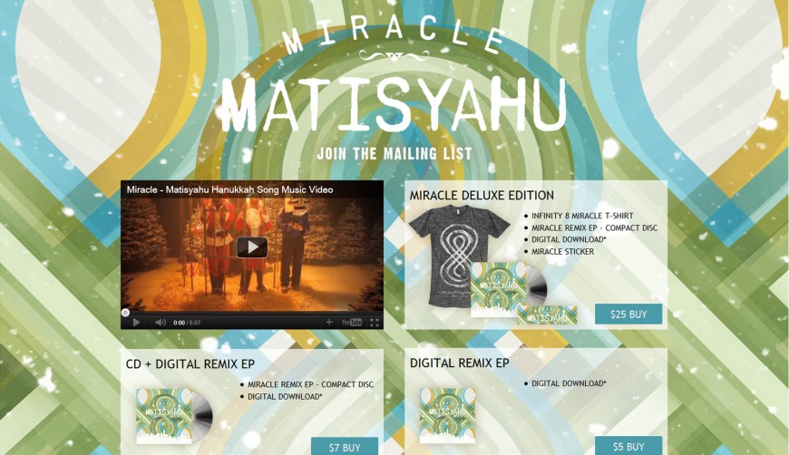 Back by popular demand, Matisyahu releases a five song Miracle EP digitally and physically today. The Miracle EP features five alternate versions of “Miracle” including a track with his band Dub Trio, a remix by freshman UC Boulder student Miniweapon, a beatboxing and acoustic version. You can also get a version with guest vocals by rapper Shyne exclusively at iTunes and www.matisyahuworld.com.