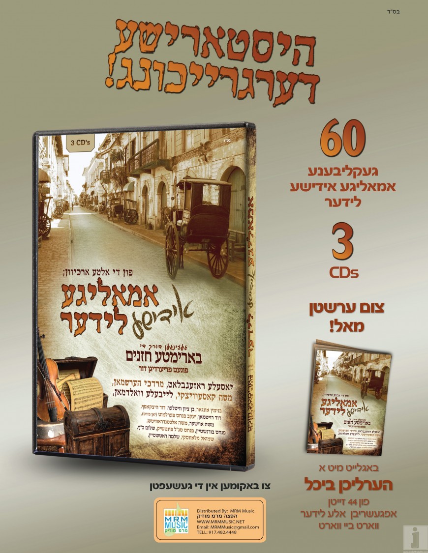 New form MRM Music Amuliger Yiddish Lieder a 3 CD and 44 page color booklet set with 60 songs sung by chazunim of old. For the in history every word to every song has been written down and can be followed along in the beautiful booklet. This rich set can be purchased at your local music store or online at www.mrmmusic.net
