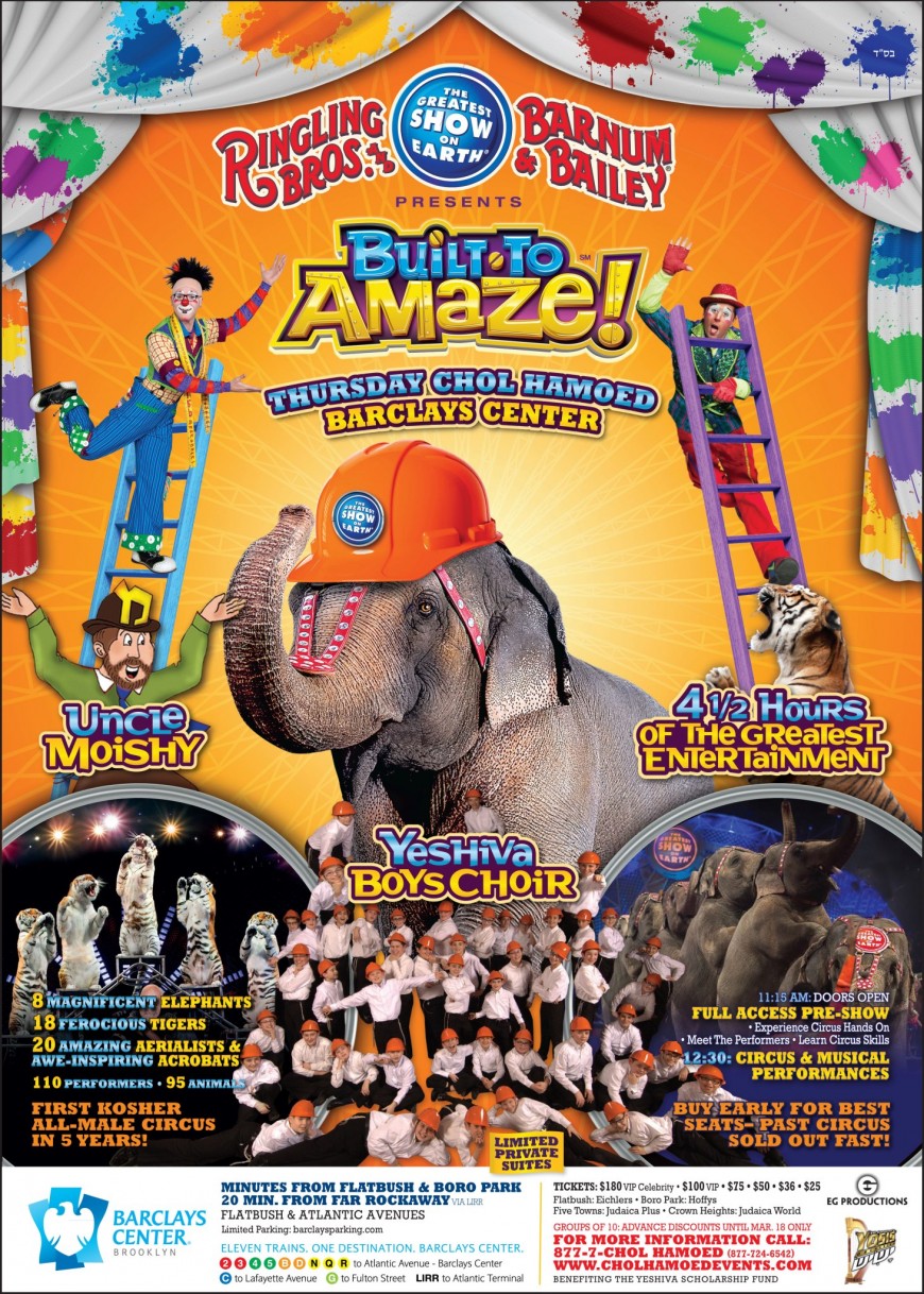 The Yeshiva Boys Choir, Uncle Moishy & The Ringling Brothers & Barnum & Baily Circus (all male cast) will be performing at The Barclays Center in Brooklyn. March 28th, Thursday Morning/Afternoon. Tickets will be available soon.