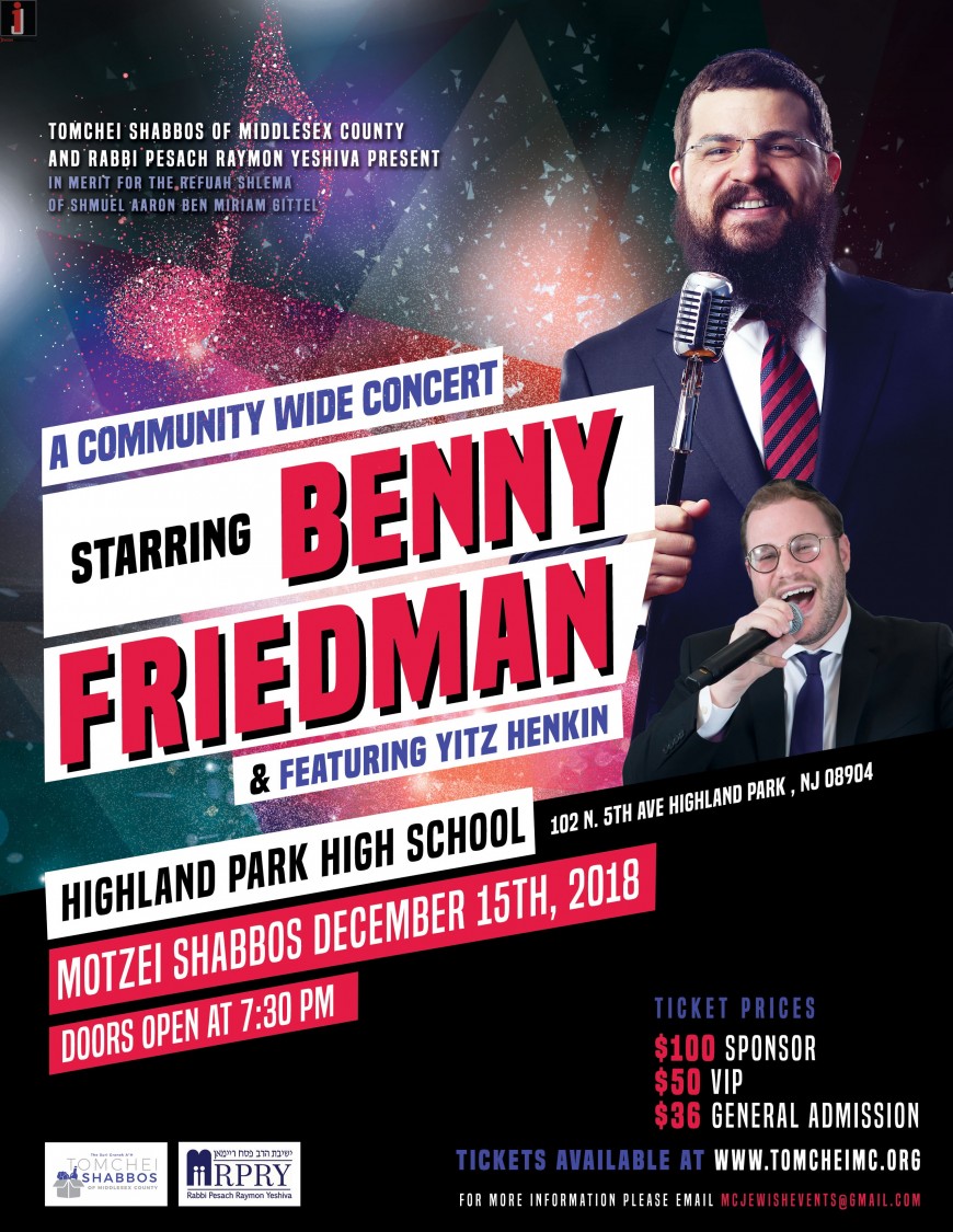 HIGHLAND PARK–American Jewish Singer, Benny Friedman will take the stage to raise awareness and funds for Tomchei Shabbos of Middlesex County and Rabbi Pesach Raymon Yeshiva (RPRY). Benny Friedman will headline the show, with a special performance by Yitz Henkin. The concert will take place at Highland Park High School on North Fifth Ave in Highland Park, NJ on Saturday night, December 15 and doors open at 7:30pm. All proceeds for the concert will benefit the many families who receive much needed food through Tomchei Shabbos and RPRY.