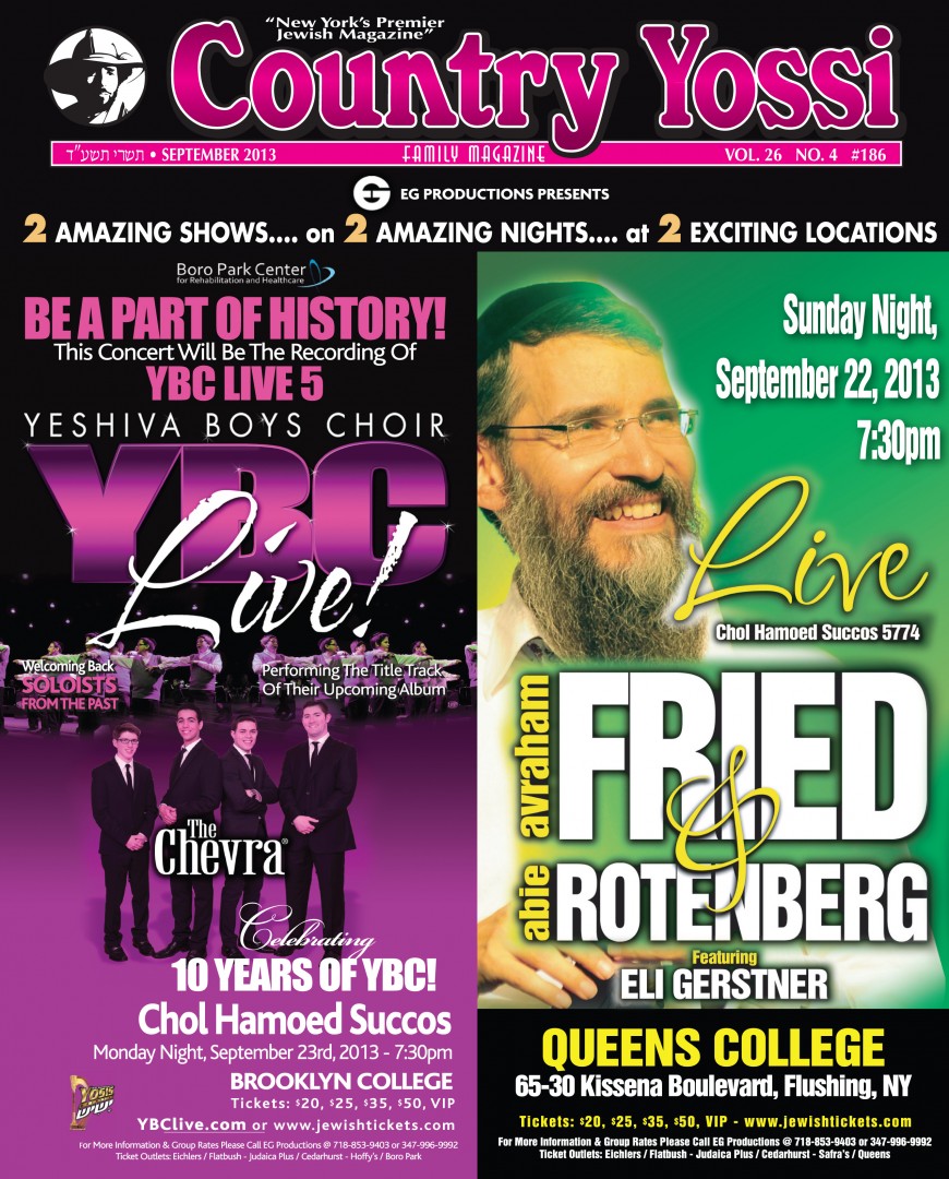 Country Yossi Sept issue hits the streets Friday featuring an exclusive interview with producer/composer/performer extraordinaire Eli Gerstner about his 2 amazing concerts scheduled for Chol Hamoed Sukkos! YBC and The Chevra in Brooklyn College and Avraham Fried, Abie Rotenberg and of course Eli G himself in Queens College. Surprises galore abound so be on the lookout and grab one before you’re left with nothing but Geklopteh Shainis!