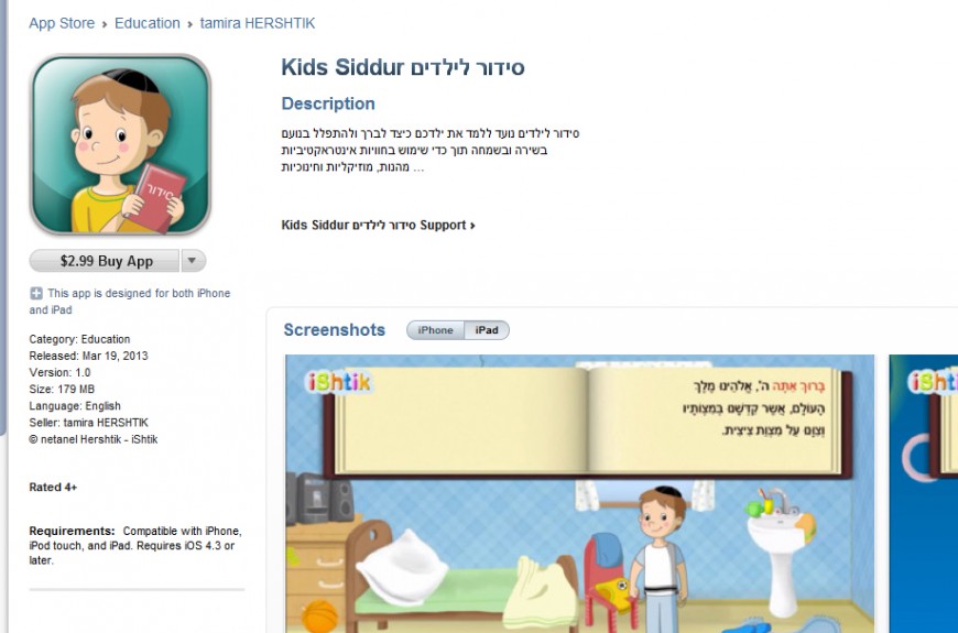 Kids Siddur is available from both iTunes and Google Play for $2.99 and is just one of several apps being developed by iShtik.
