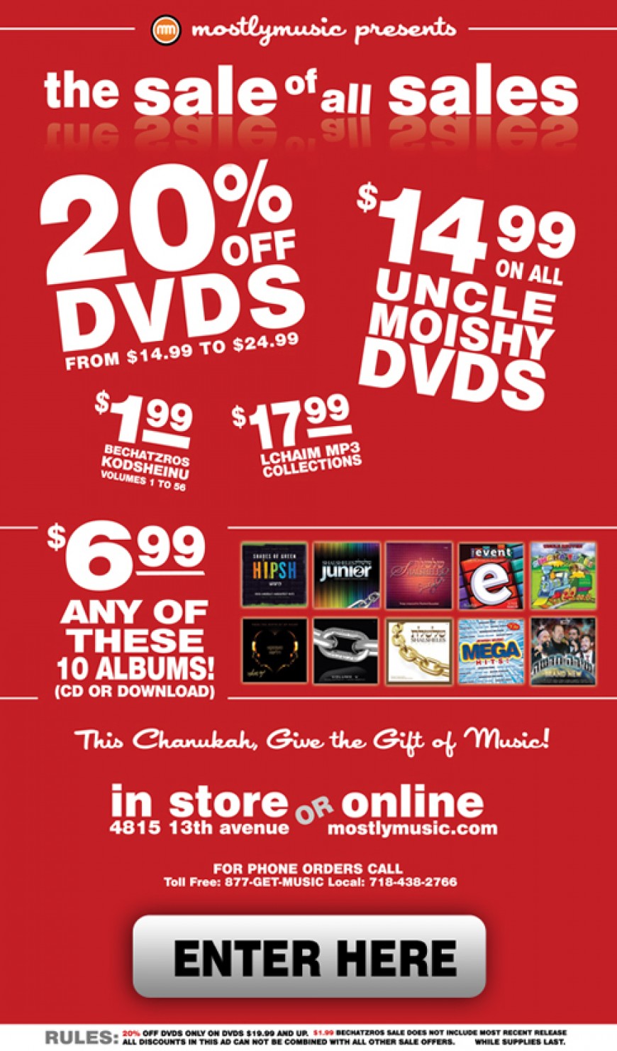 There is still time before Chanukah to get those Chanukah gifts! Mostly Music presents the Sale of all Sales! We are offering 20% Off DVDs (14.99 to 19.99), 14.99 ALL UNCLE MOISHY DVDS, $17.99 ALL LCHAIM MP3 COLLECTIONS. $1.99 CHATZROS KODSHENU DVDS 1-56. $6.99 for any the following TEN albums, CD or DOWNLOAD! (Yossi Green’s Hipsh, Shalsheles JR Volume 1 & 2, Shalsheles 4 & 5, The Event CD, Simcha Train, Lipa’s Meimka Dlipa, Mega Hits! & Shira Chadasha: Brand New)