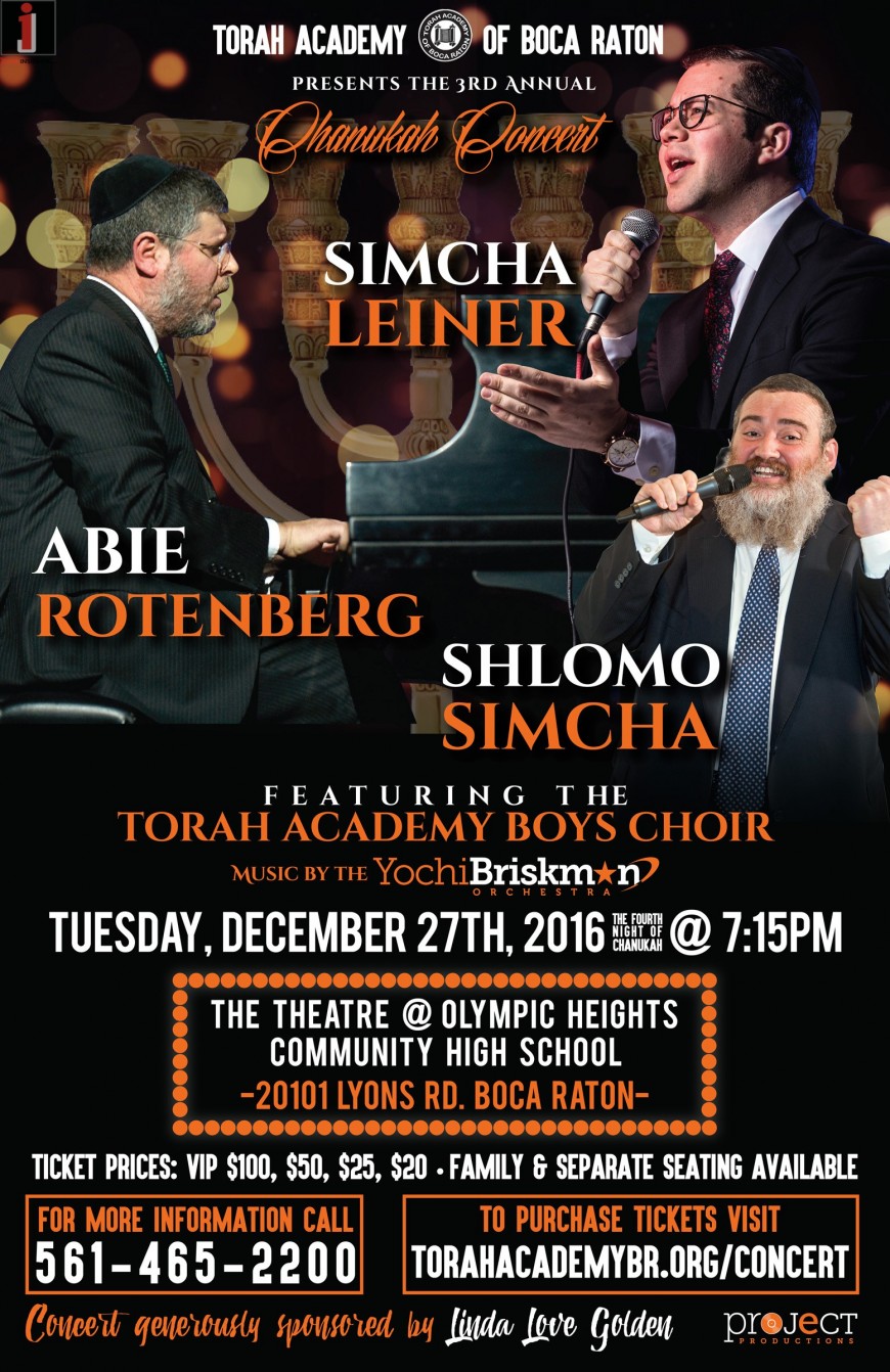 TA of Boca Raton Presents The 3rd Annual Chanukah Concert: SIMCHA LEINER, ABIE ROTENBERG & SHLOMO SIMCHA