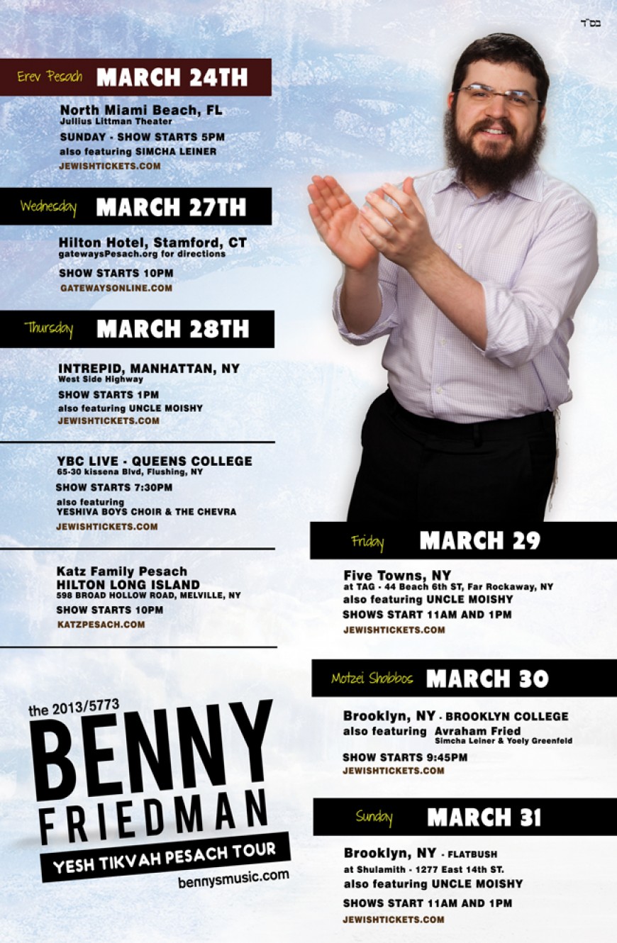Looking for a good show this Pesach? Here is a full rundown of shows where Benny Friedman will be performing this Yom Tov season.