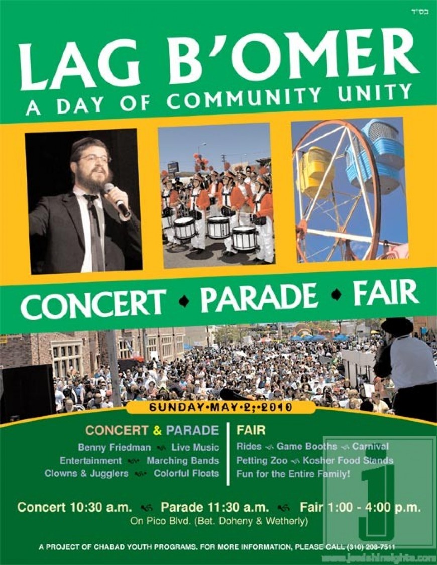Sunday, May 2nd there will be a concert, parade, and fair in honor of Lag Ba’Omer in Los Angeles. They will have Live Music, Benny Friedman will perform, a marching band, clowns, jugglers, game booths, petting zoo, Kosher food stands, floats and much more!