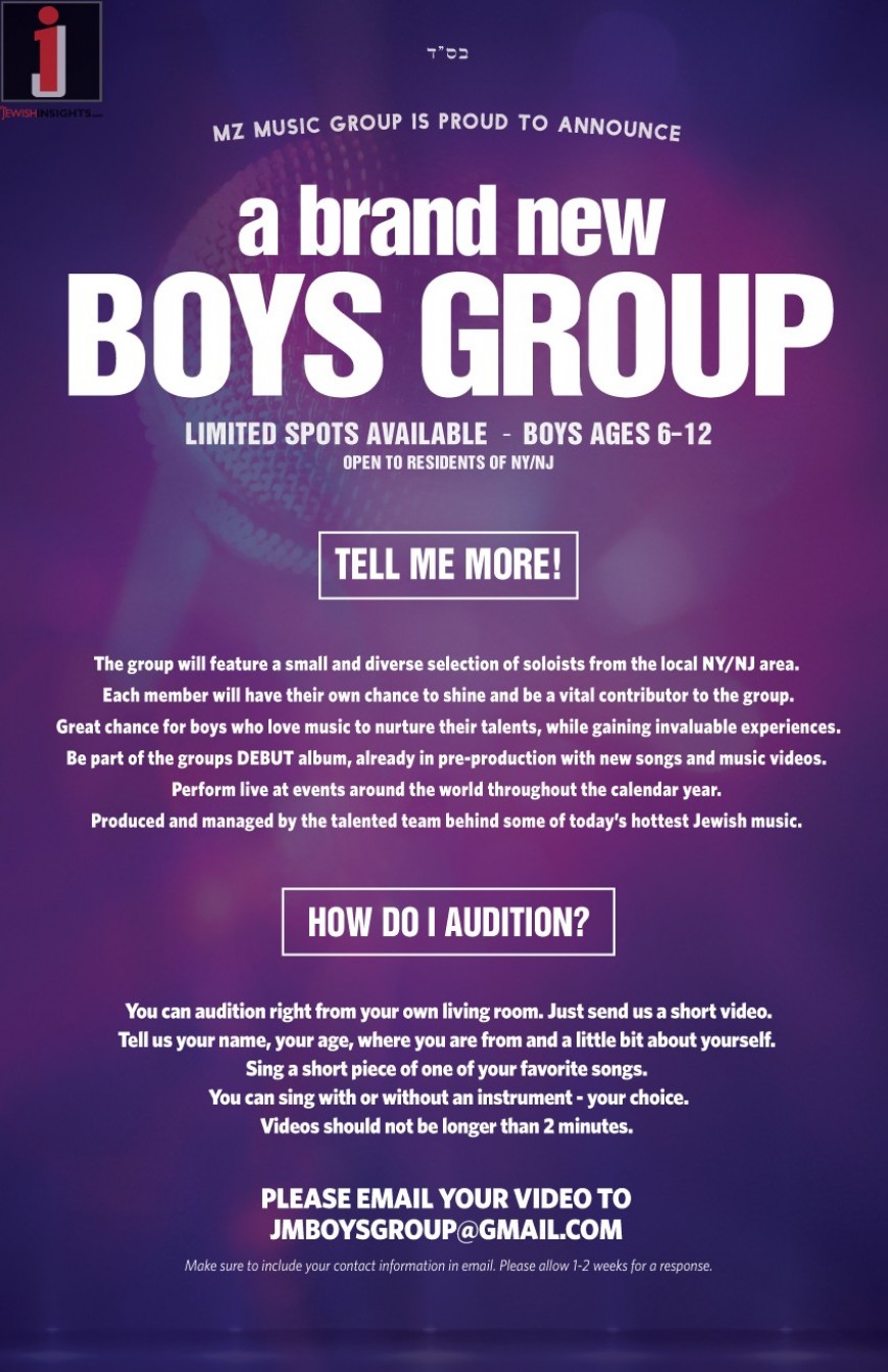 The group will feature a small and diverse selection of soloists from the local NY/NJ area. Each member will have their own chance to shine and be a vital contributor to the group. Great chance for boys who love music to nurture their talents, while gaining invaluable experiences. Be part of the groups DEBUT album, already in pre-production with new songs and music videos. Perform live at events around the world throughout the calendar year. Produced and managed by the talented team behind some of today’s hottest Jewish music.