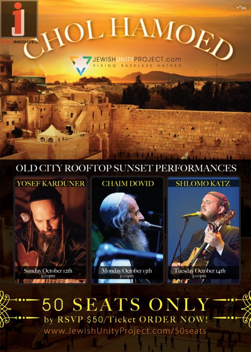 You are invited to join us on the Jewish Unity Project’s Old City Rooftop at sunset for a intimate, musical experience. This is a once in a lifetime opportunity to get to know your favorite Jewish music artists personally and get spiritually infused by their music and Torah. ONLY 50 seats available for each performance, $50 a seat by reservation. Tickets will be sold by PRESALE reservations only.