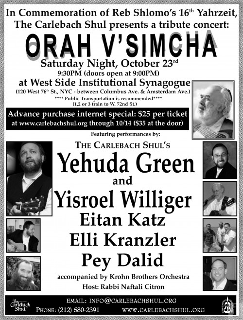 In Commemoration of Reb Shlomo’s 16th Yahrzeit, The Carlebach Shul presents a tribute concert: ORAH V’SIMCHA