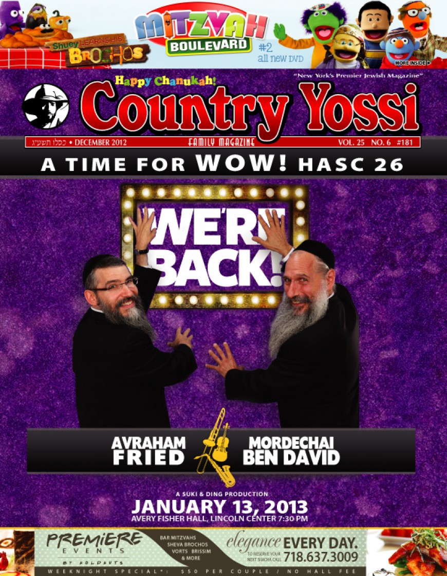 Country Yossi‘s spectacular Chanukah issue hits the streets Fri with an exclusive, in-depth look at the upcoming HASC 26 concert which will feature the long awaited (10 years) MBD and Avraham Fried re-union! Also featured is the new best-selling Mitzvah Boulevard DVD, the Z Report and plenty of other award winning features and articles of enduring interest!