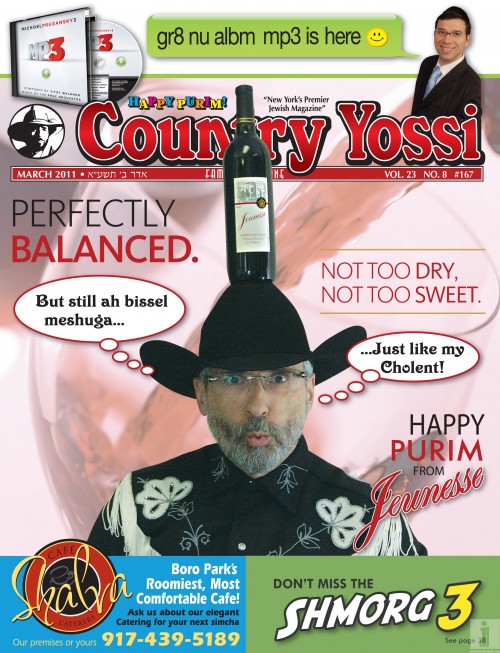 This Friday Country Yossi Magazine #167 hits stores everywhere! Everyone who is anyone knows that the Purim issue is the most sought after issue. This years issue features articles/interviews on Michoel Pruzansky’s latest smash album MP3, Badchen and Rebbe Yoely Lebovitz with his latest comedy CD Boon-dash and the world renown Oorah Shmorg 3 featuring the Mashal Man 2, The Living Torah Museum’s Perek Shira, Fiveish Dance, Yankel Am Ha’aretz, Abie Rotenberg singing Yeshivishe Reid with ALL NEW LYRICS and more. So make sure you get your copy this erev shabbos.