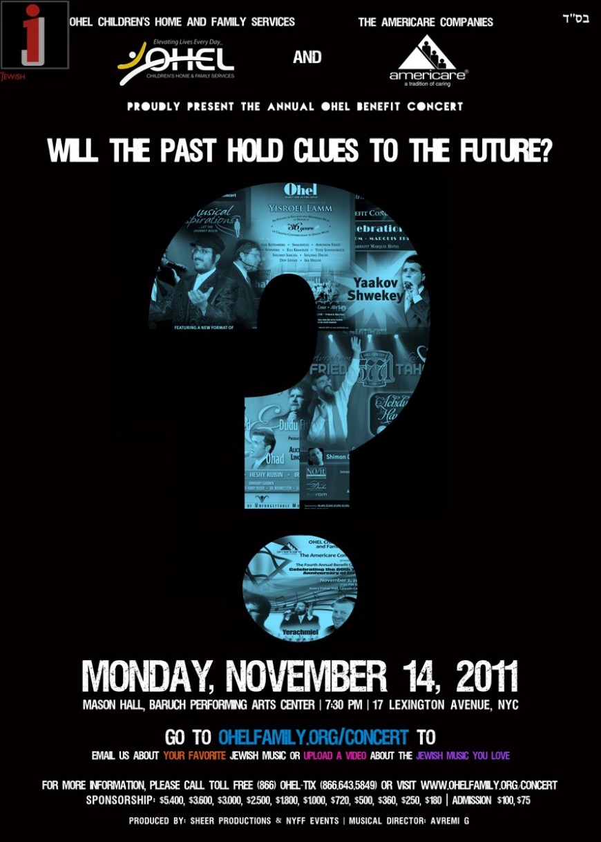 The show will be held on November 14th, 2011 at Mason Hall, Baruch Performing Arts Center at 7:30 PM. Located at 17 Lexington Avenue, NYC. Go to OhelFamily.Org/Concert to Email us about your favorite Jewish music or Upload A Video about the Jewish music you love! For more information, please call Toll Free (866) OHEL-TIX (866.643.5849) or visit www.ohelfamily.org/concert. Produced by: Sheer Productions & NYFF Events | Musical Director: Avremi G.