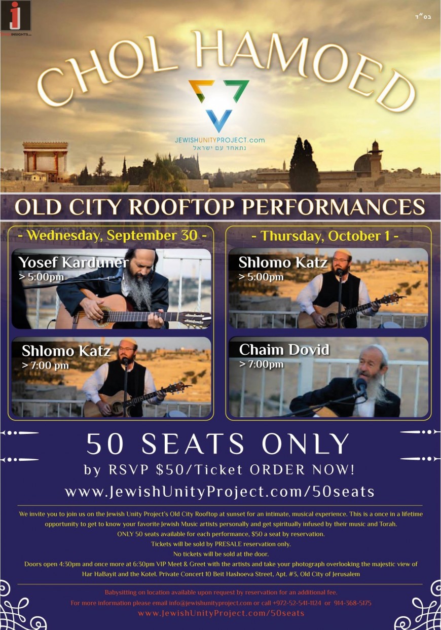 We invite you to join us on the Jewish Unity Project’s Old City Rooftop at sunset for an intimate, musical experience. This is a once in a lifetime opportunity to get to know your favorite Jewish Music artists personally and get spiritually infused by their music and Torah. ONLY 50 seats available for each performance,$50 a seat by reservation. Tickets will be sold by PRESALE reservation only. No tickets will be sold at the door.