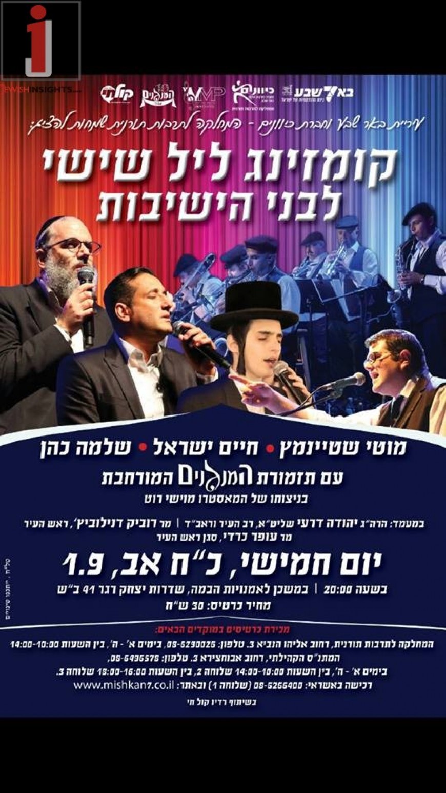 This is the second year in a row that the city of Be’er Sheva and the company Kivumin are sponsoring the “Kumzing” event for Bnei Yeshiva. The event this year, Kumzing Leil Shishi will take place at Heichal HaTarbut in Be’er Sheva on Thursday 28th of Av, the last Thursday night before the Elul Zman starts. Kumzing is honored to host music stars Shlomie Cohen, Chaim Israel, and Motty Steinmetz accompanied by the famous HaMenagnim Orchestra led by their maestro Moishe Roth.