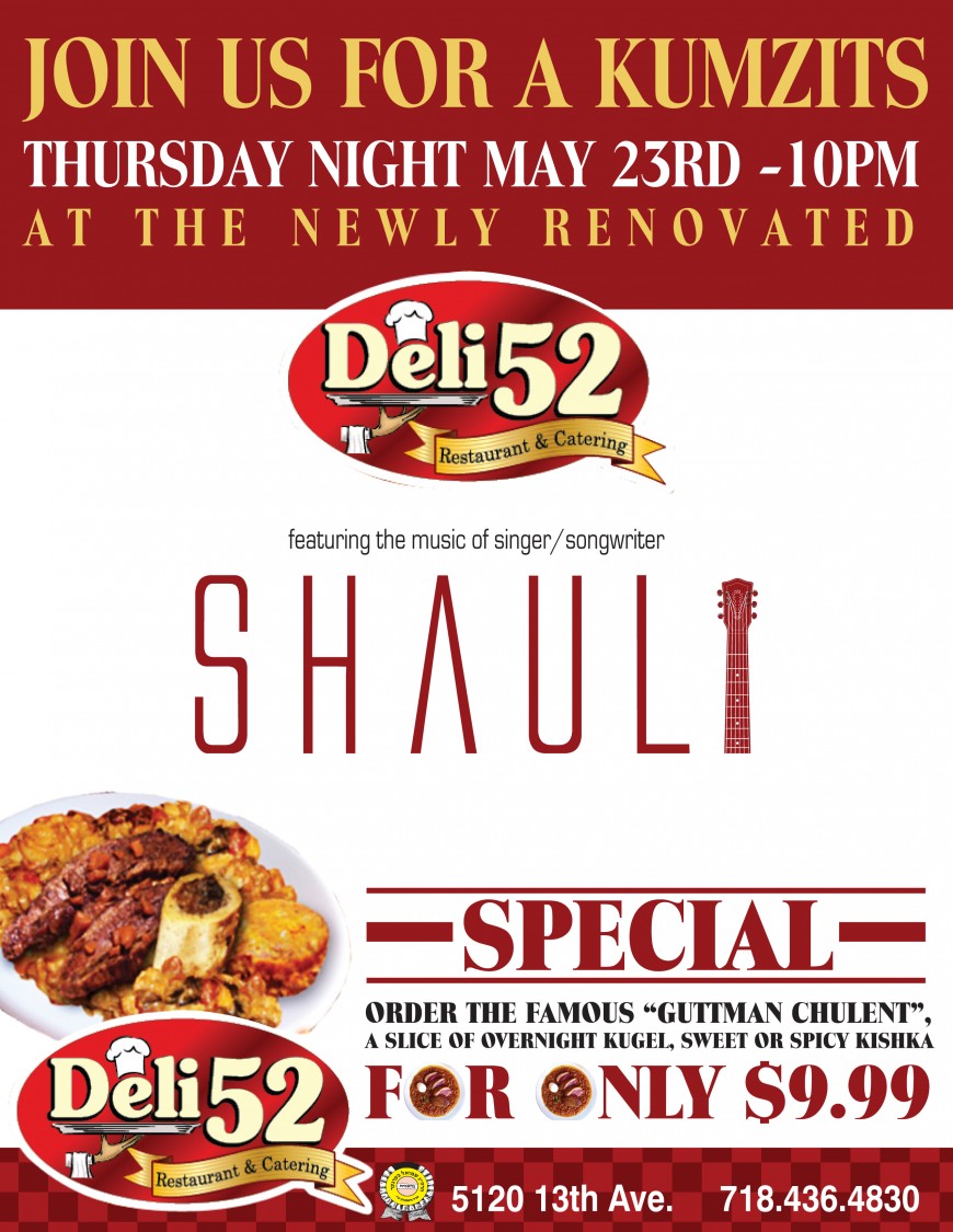 Please join singer and songwriter SHAULI this Thursday night @ the NEWLY RENOVATED Deli52 for a Kumzits and some great food!