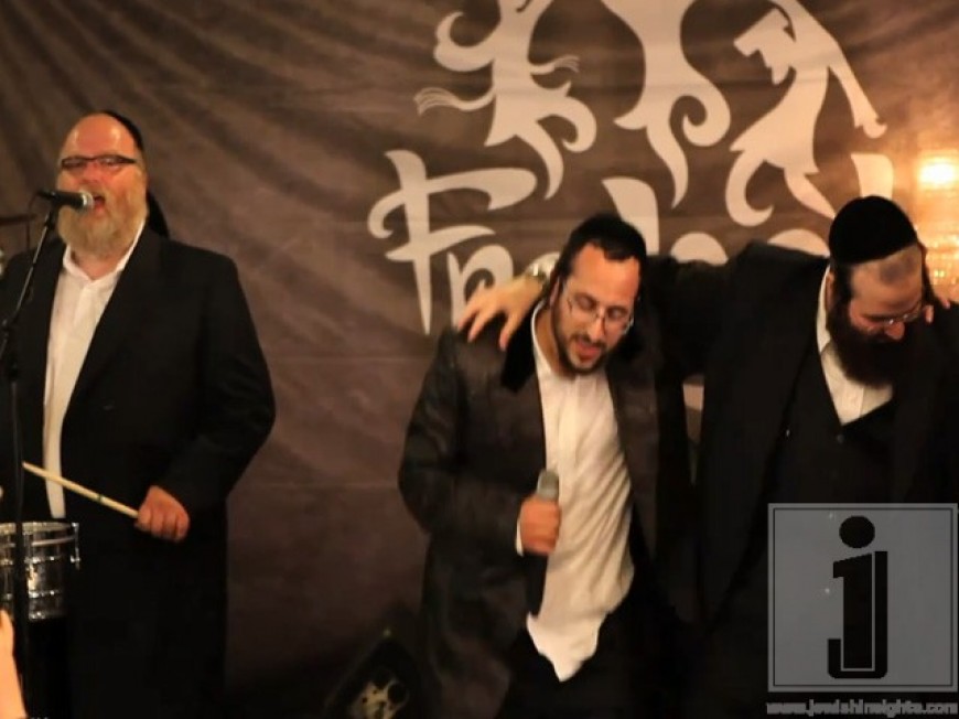 Michoel Schnitzler plays the drums while he sings with Lipa Schmeltzer and Shloime Taussig at a wedding in Brooklyn, NY.