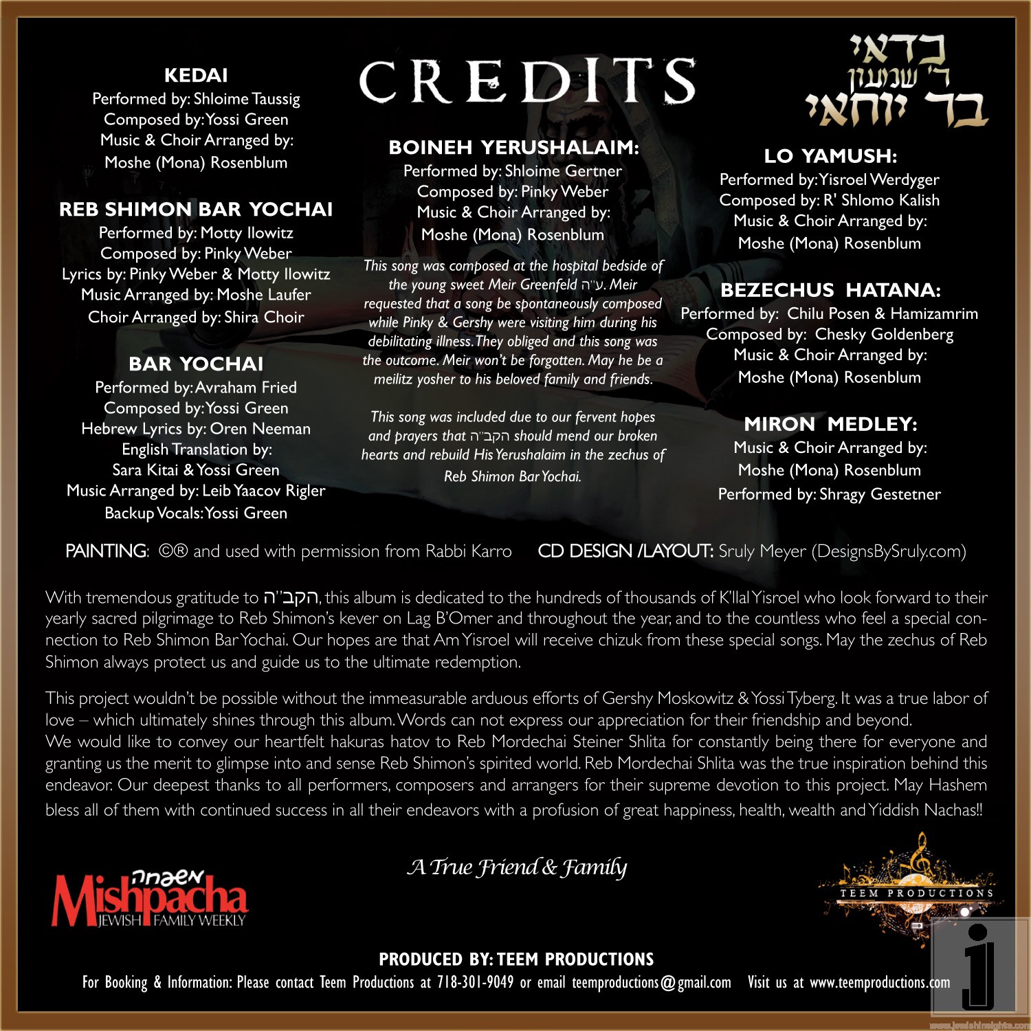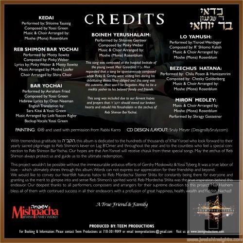 Mishpacha Magazine will be including a little something extra in your Peasch issue this year, a brand new CD. The album entitled “Kedai R’ Shimon Bar Yochai” is produced by TeeM Productions. “Kedai R’ Shimon Bar Yochai” includes brand new songs composed by Yossi Green & Pinky Weber. Arranged by Mona Rosenblum, Moshe Laufer and Leib Yaacov Rigler. The vocals are done by the best and most sought in the business, Avraham Fried, Shloime Gertner, Shloime Taussig, Yisroel Werdyger, Shragy Gestetner, Motty Ilowitz and Chilu Posen. The CD will have 7 songs. Check back here in the next few days for a sampler.