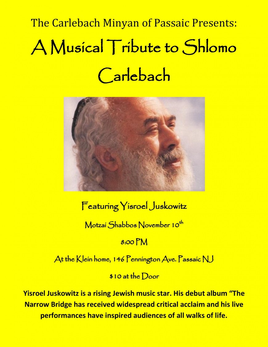 In memory of his Yartzheit last week on the 16th of Cheshvon (November 1st), Famed performer Yisroel Juskowitz along with Hillel Kapnick will be performing the compositions of legendary composer R’ Shlomo Carlebach. Yisroel is best known for his inspiring performances as well as his album entitled “The Narrow Bridge“. Yisroel has played and performed with countless names in Jewish Music such as Nochi Krohn, Eitan Katz, Baruch Levine, and Yoshi Fruchter. Hillel is best known for his singles “Min Hameitzar“, and “Hadran” which was featured at the siyum Hashas. The concert will be taking place Motzai Shabbos November 10th at 146 Pennington Avenue Passaic, NJ.Admission is $10 at the door and the concert will start at 8pm.