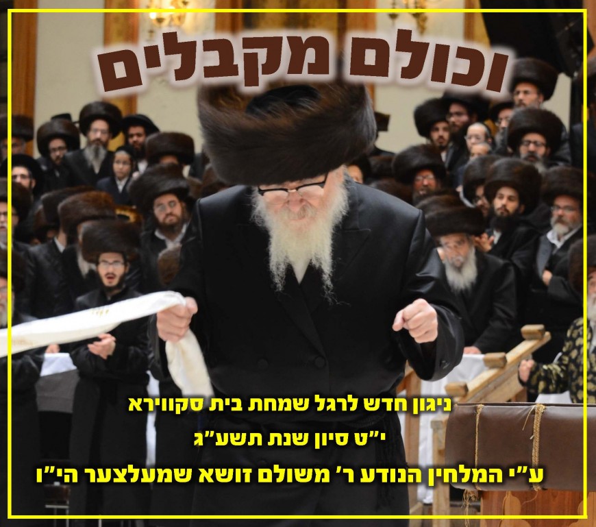 In honor of the simcha a new song was released called “Ve’chulam Mekablim Aleihem” and composed by R’ Meshulem Zusha Schmeltzer.