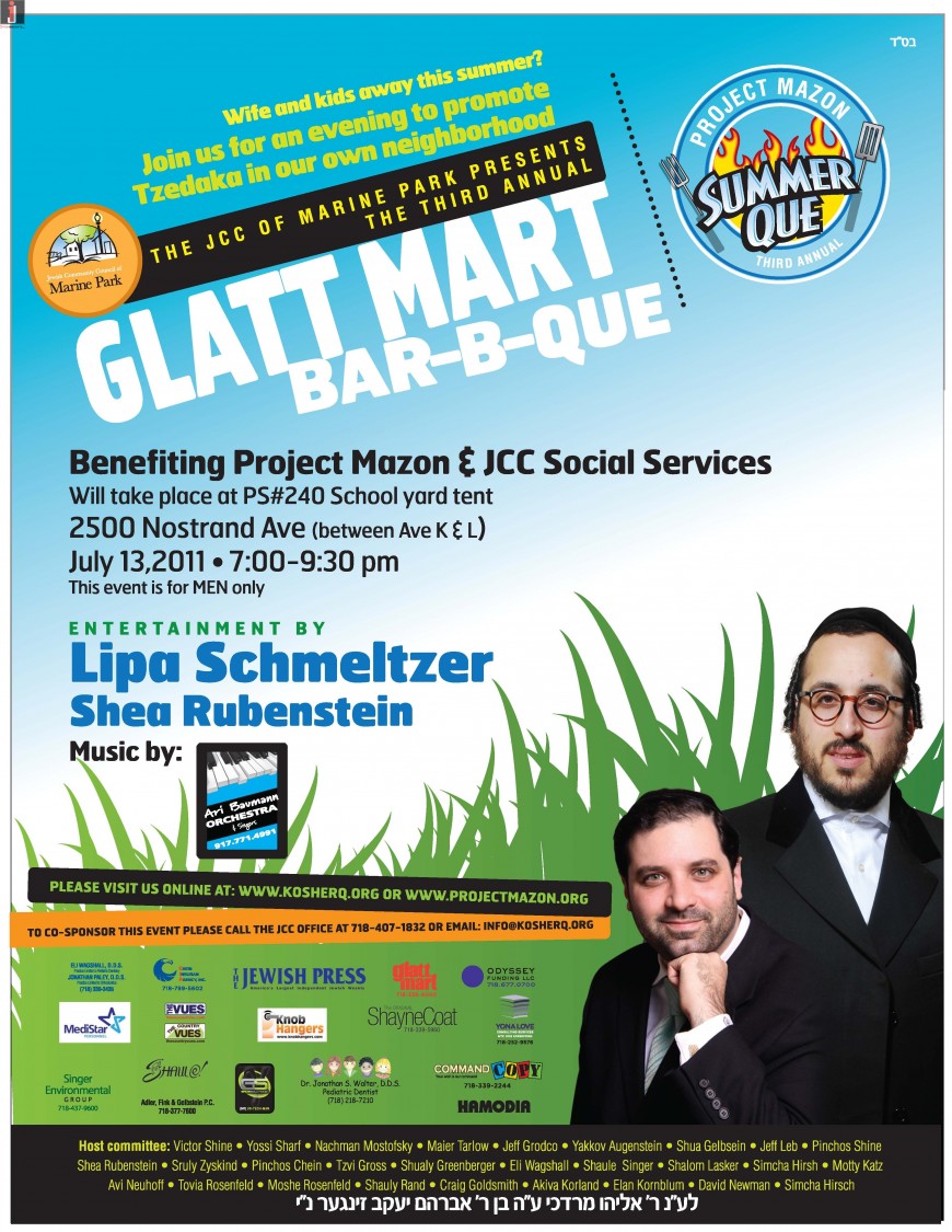 On Wednesday, July 13, 2011 I’yh, at 7:00 PM, The Jewish Community Council of Marine Park (JCCMP) will host the 3nd Annual Glatt Mart / JCC -Project Mazon Barbecue.