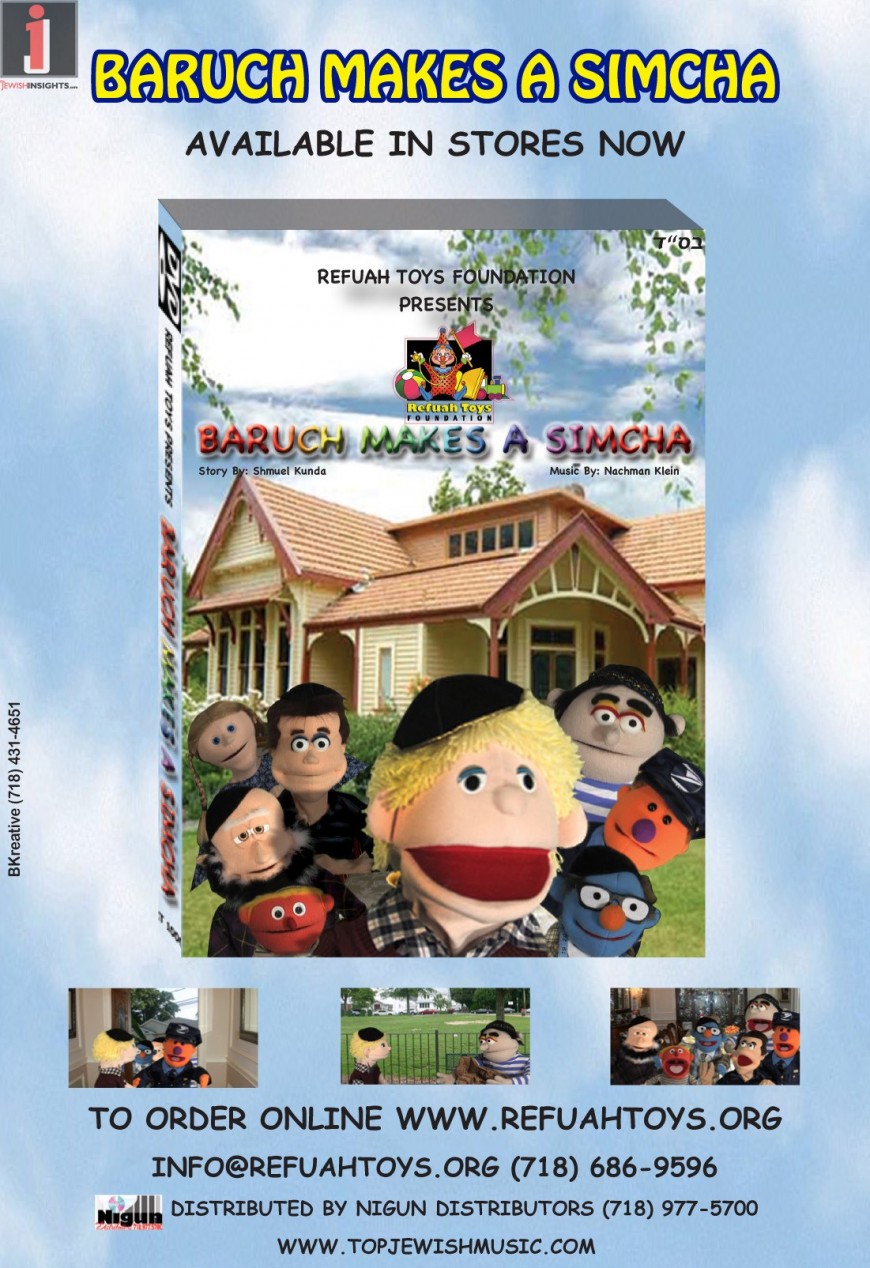 REFUAH TOYS FOUNDATON has teamed up with the world renowned Shmuel Kunda, best known for his educational and musical CD’s, DVD’s and story books. Together, they released another educational masterpiece DVD entitled BARUCH MAKES A SIMCHA. This musical and fun filled DVD will teach your children or grandchildren about the mitzvos of Pidyon Haben, Bris Milah, Chanukas Habayis, Bar Mitzvah, Wedding and Sheva Brachos. A DVD that is guaranteed to have your children or grandchildren laughing and singing while they are learning about these great Mitzvos. The DVD will be distributed by Nigun and is available on TopJewishMusic.com.