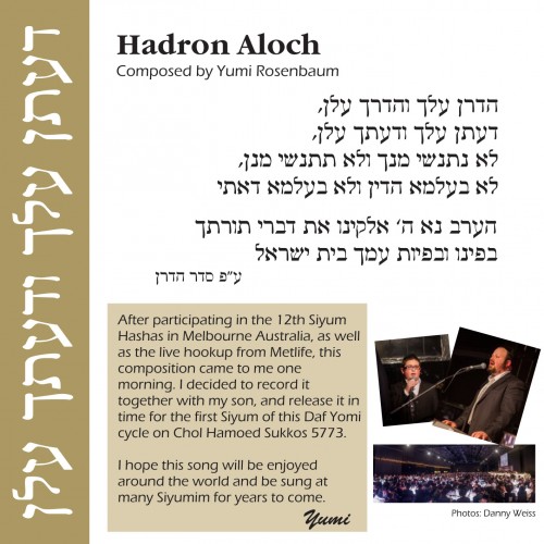 After participating in the 12th Siyum Hashas in Melbourne Australia, as well as the live hookup from Metlife, Yumi was inspired to compose this song and decided to record it together with his son Laizer. It has been released in time for the first Siyum of this Daf Yomi cycle on Chol Hamoed Sukkos 5773. The project spanned 3 continents, recorded in Australia, the USA, and Israel.