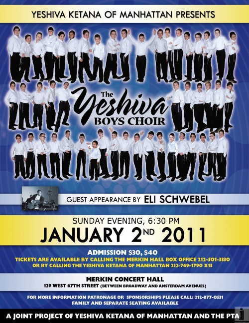 THIS SUNDAY – Yeshiva Ketana of Manhattan presents The YESHIVA BOYS CHOIR with guest Appearance by ELI SCHWEBEL