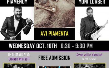 Chabad of North Hollywood & Chabad of The Valley p r e s e n t Community Sukkot Festival With PIAMENDY, AVI PIAMENTA & YONI LORBER Wednesday, October 17th, 6:30-9:30pm FREE ADMISSION Children’s Program – Street Performers – Kosher Food