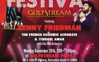 32nd Annual South Florida CHANUKAH FESTIVAL featuring BENNY FRIEDMAN The French Hassidic Acrobats & Yisroel Amar accompanied by the YBO Orchestra Monday December 26th, 2011 – 7:00pm at GulfStream Park 901 S. Federal Highway, Hallandael Beach, Fl 33009 FREE ADMISSION