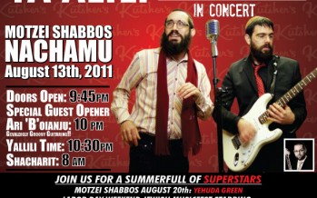 The New Kutshers Resort presents GET READY TO REALLY YA’ALILI EIG8TH DAY In Concert Motzei Shabbos NACHAMU August 13th, 2011 Doors Open: 9:45pm Special Guest Opener Ari ‘B’oianju-Gevaldigly Groovy Guitaring!!: 10:00pm Yallili Time: 10:30pm Shacharit: 8:00am Tickets: $18-Groups of 10