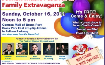 Join us for a Chol Ha’moed Jewish Music Festival Family Extravaganza Sunday, October 16th, 2011 Noon to 5pm Comras Mall of Bronx Park Bronk Park East at Lydig Avenue In Pelham Parkway It’s FREE! Come & Enjoy. Succah on Site!