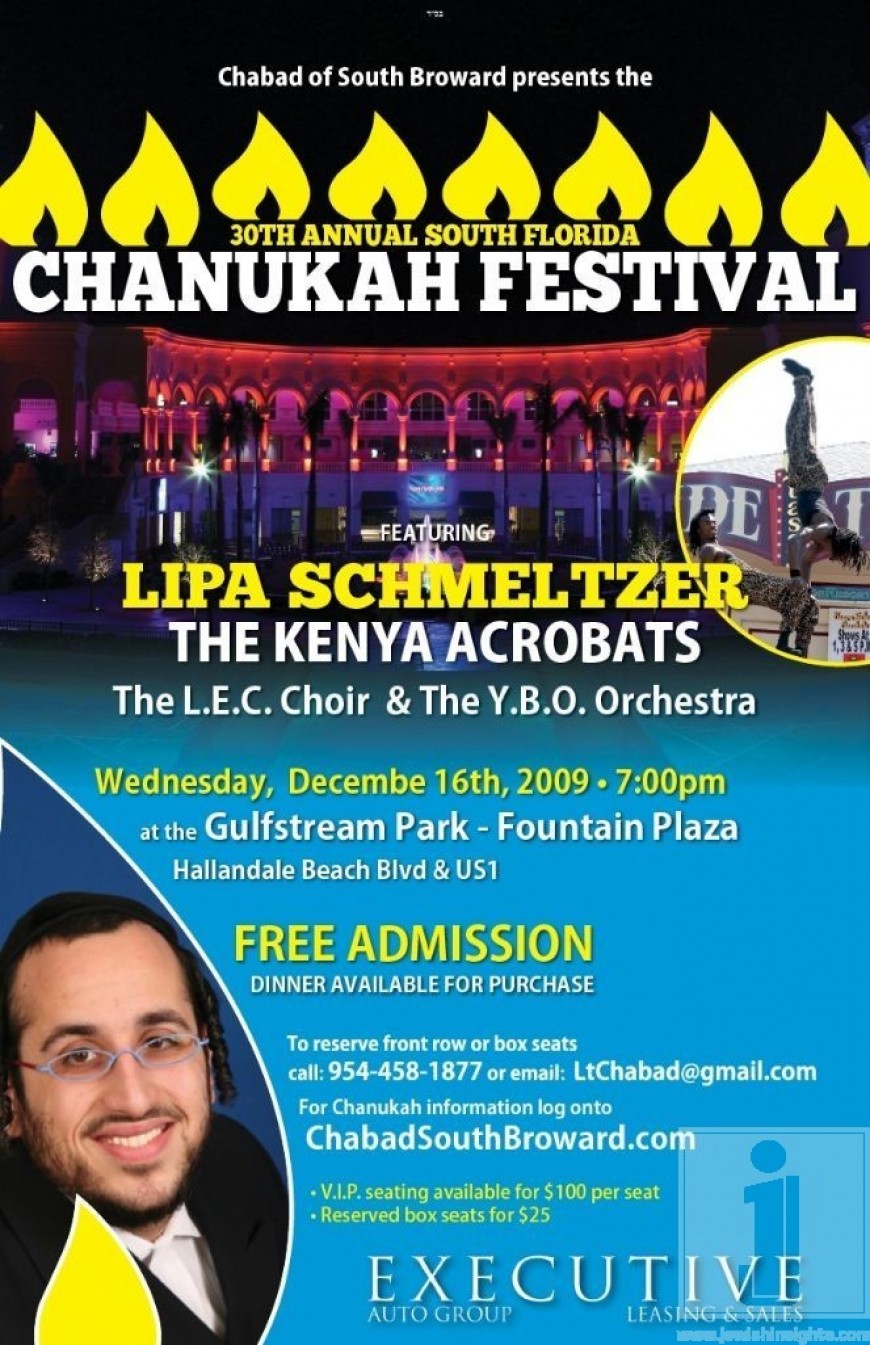 Over 10,000 are expected to attend the 30th annual south Florida Chassidic Chanukah Festival, which will include performances from popular Jewish music star Lipa Schmeltzer and the Kenyan Safari Acrobats. The L.E.C. Choir will perform and music by the YBO Orchestra.
